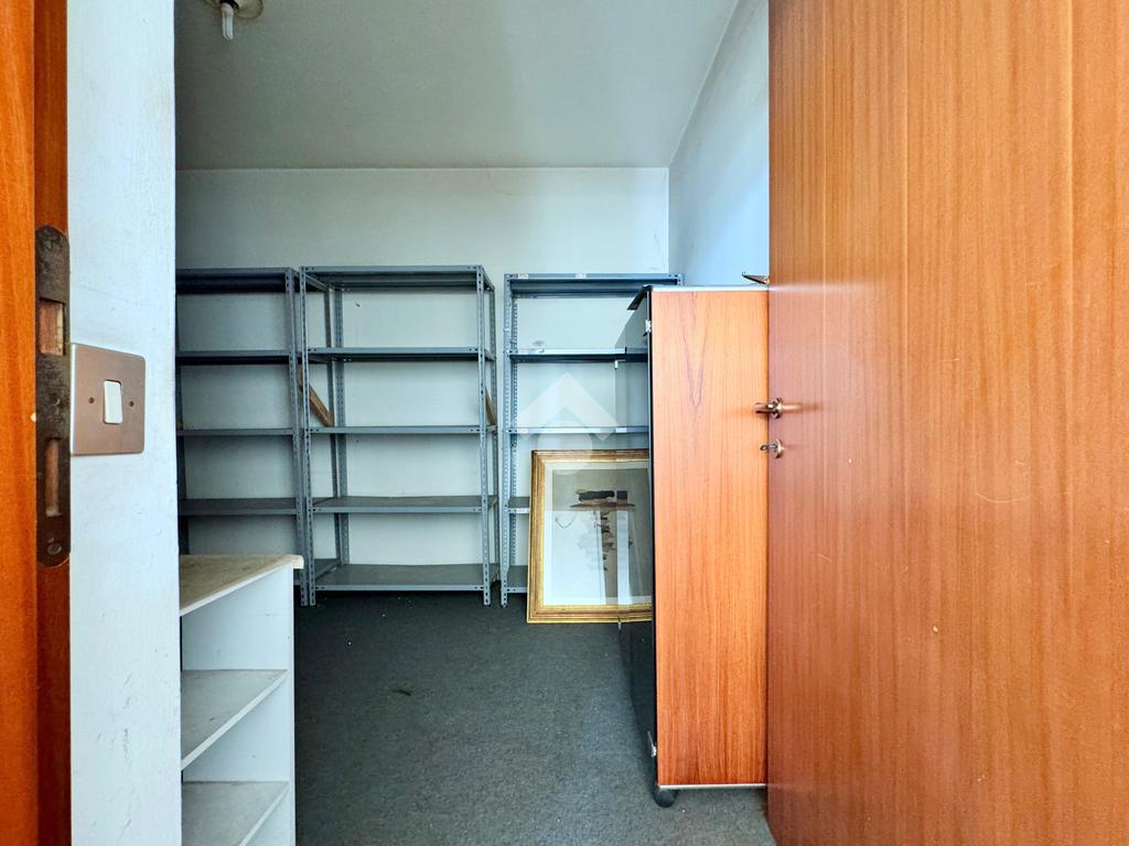 Una porta introduce al disimpegno, che divide gli ambienti sul retro caratterizzati da un ripostiglio con mensole e scrivania ed il bagno.