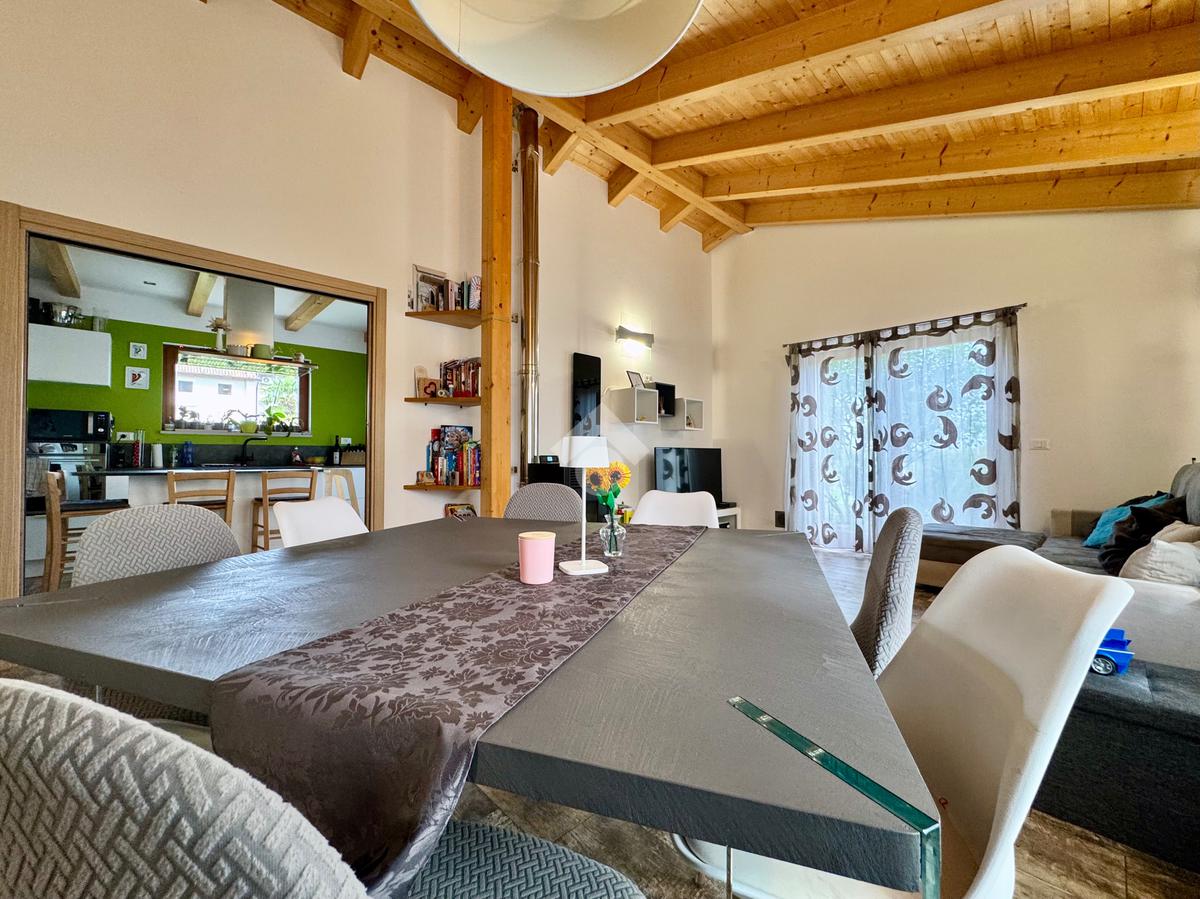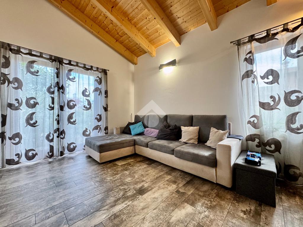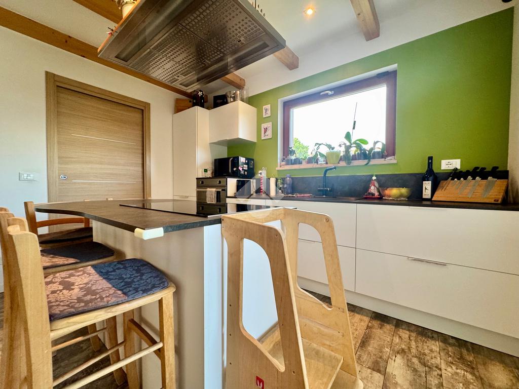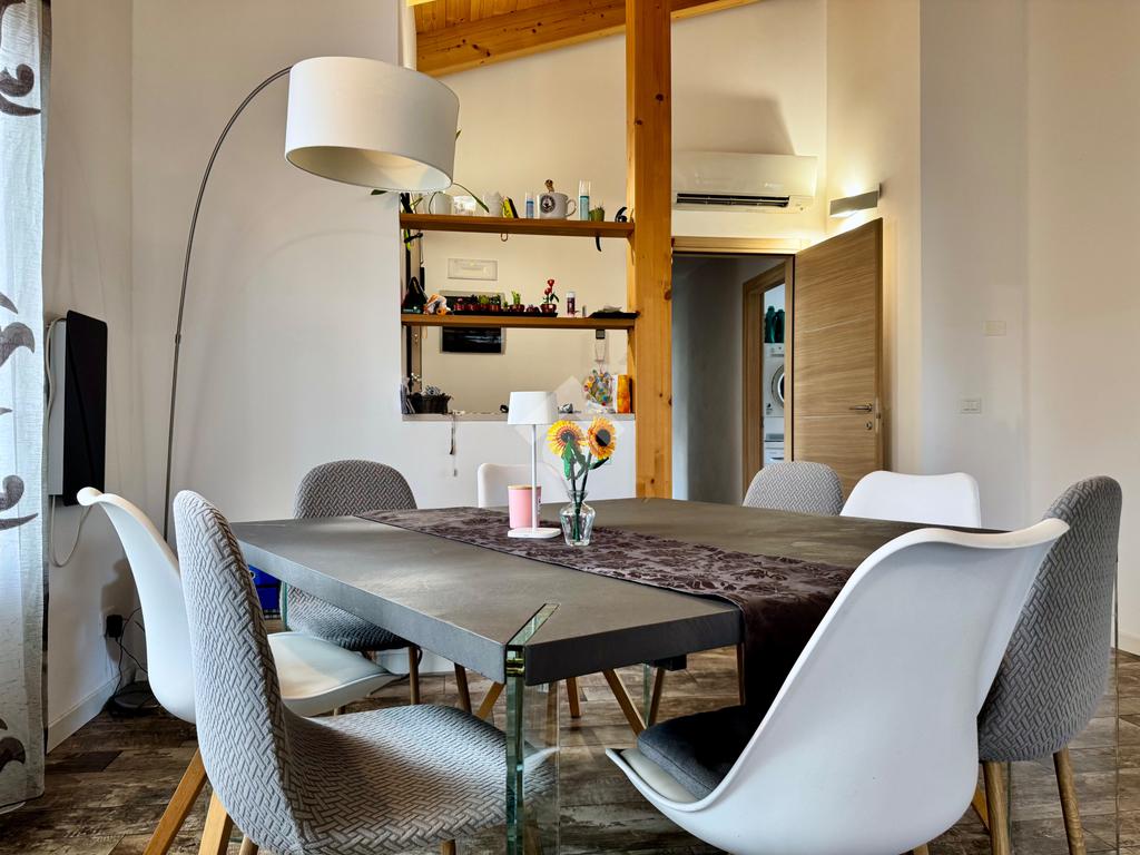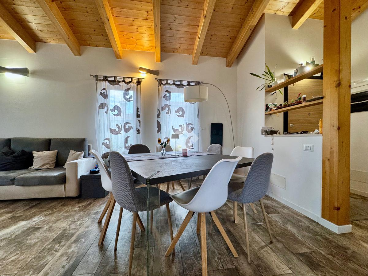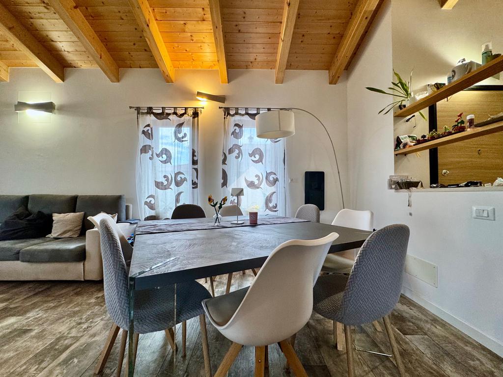 Gli ambienti della zona giorno, oltre ad avere spazi generosi, presentano anche soffitti molto alti con rifiniture di travi in legno a vista, pavimenti in grès porcellanato effetto legno stampato, mentre nella zona notte il laminato in rovere coprirà tutta la superficie delle camere e del corridoio.